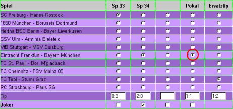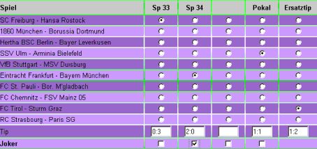 Von diesen 10 Spielen kann man sich pro Spieltag eins aussuchen, wobei in Spieltag 2 und 3 jeweils ein anderes Spiel getippt werden muß, als in Spieltag 1.